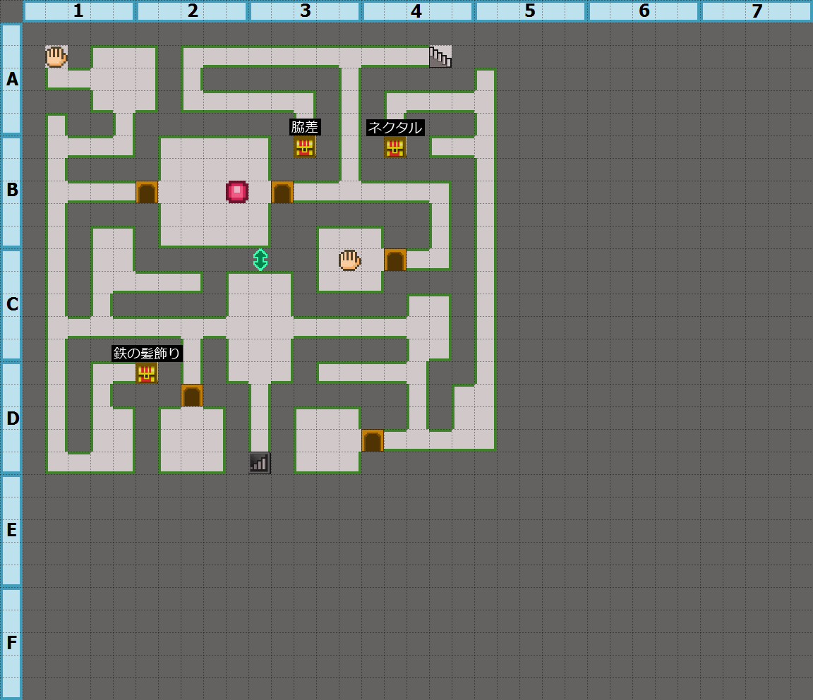 世界樹の迷宮2 | 1階の詳細 このページでは、世界樹の迷宮2の1階のマップや達成できるクエスト、更新できる装備・アイテムなどの詳細をまとめて掲載しています。 第1層のチャートを見る 1階のマップ詳細 1階の宝箱 No座標名称備考 1B-3脇差 2B-4ネクタル 3D-2鉄の髪飾り 1階の採集ポイント 採取-A-1採取-C-3 1階で完了できるクエスト クエスト必要項目 こぼれ出ずる清廉 皮職人の依頼 1階で更新できる装備 武器 名称カテゴリ必要素材 ファルカタ剣ねずみの針×1 アムードの杖杖殻のカケラ×2 マイマイクラブ杖殻のカケラ×30 カリンガ斧土竜のカギ爪×1 ネイルウィップ鞭小さな鉄爪×1 防具・アクセサリ 名称カテゴリ必要素材 グリーンリーフ体防具ねずみの針×2、殻のカケラ×1 レザージャーキン体防具やわらかい皮×2 鉄の髪飾り頭防具殻のカケラ×3、小さな鉄爪×1 革の手袋腕防具やわらかい皮×1 消費アイテム 名称必要素材 ネクタル小さな花×1 テリアカα小さな花×2、小さな鉄爪×1 ファイアオイル綿の実×1 フリーズオイル綿の実×1 ショックオイル綿の実×1 獣避けの鈴すっぱい実×1 斥候用の長靴すっぱい実×2 関連記事 第1層のチャートを見る サイトTOP 世界樹の迷宮2 攻略TOPに戻る おすすめ記事 おすすめパーティー編成レベル上げおすすめポイント最強装備引退システムのメリットは? 攻略チャート 第1層(1~5階)第2層(6~10階)第3層(11~15階)第4層(16~20階)第5層(21~25階)第6層(26~30階) フロア詳細 第1層1階2階3階4階5階第2層6階7階8階9階10階第3層11階12階13階14階15階第4層16階17階18階19階20階第5層21階22階23階24階25階第6層26階27階28階29階30階 攻略 キャラクター(職業)の特徴スキル一覧ミッション一覧クエスト一覧アチーブメント(実績)ボス攻略 データ 武器体防具盾頭防具腕防具脚防具アクセサリ消費アイテム素材敵採集ポイント